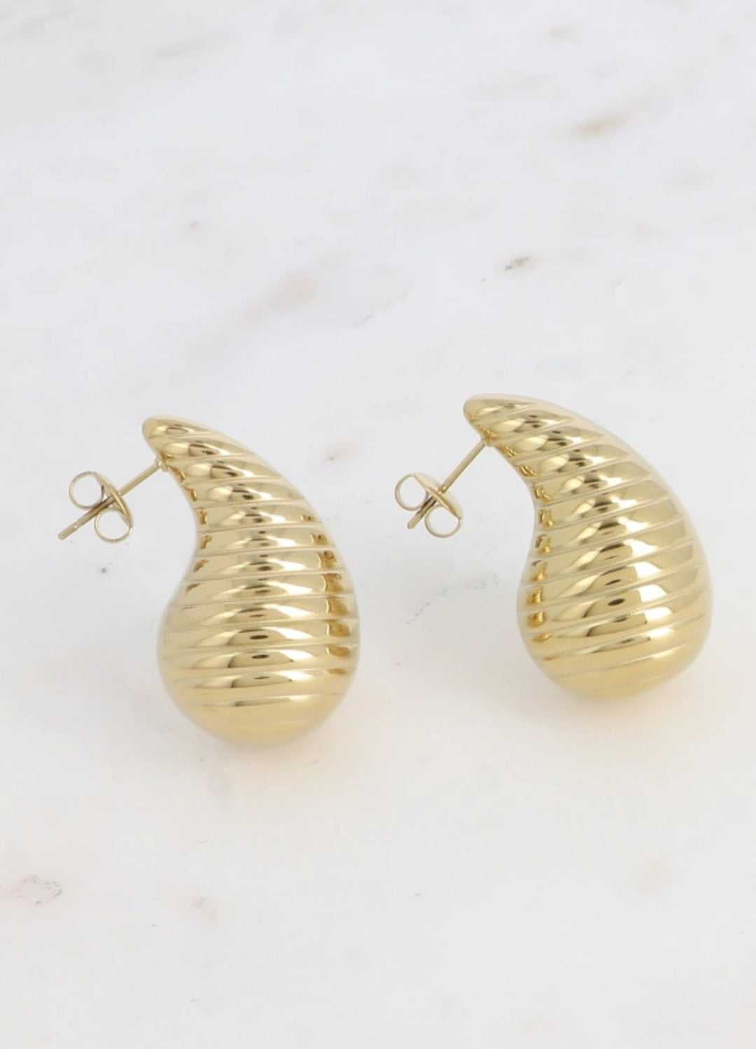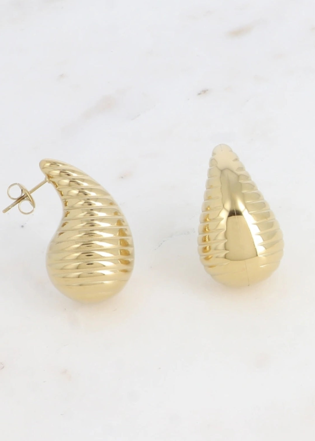 Boucles d'oreilles en acier inoxydable composées d'une forme de goutte bombée pendante aux lignes striées sur les côtés.