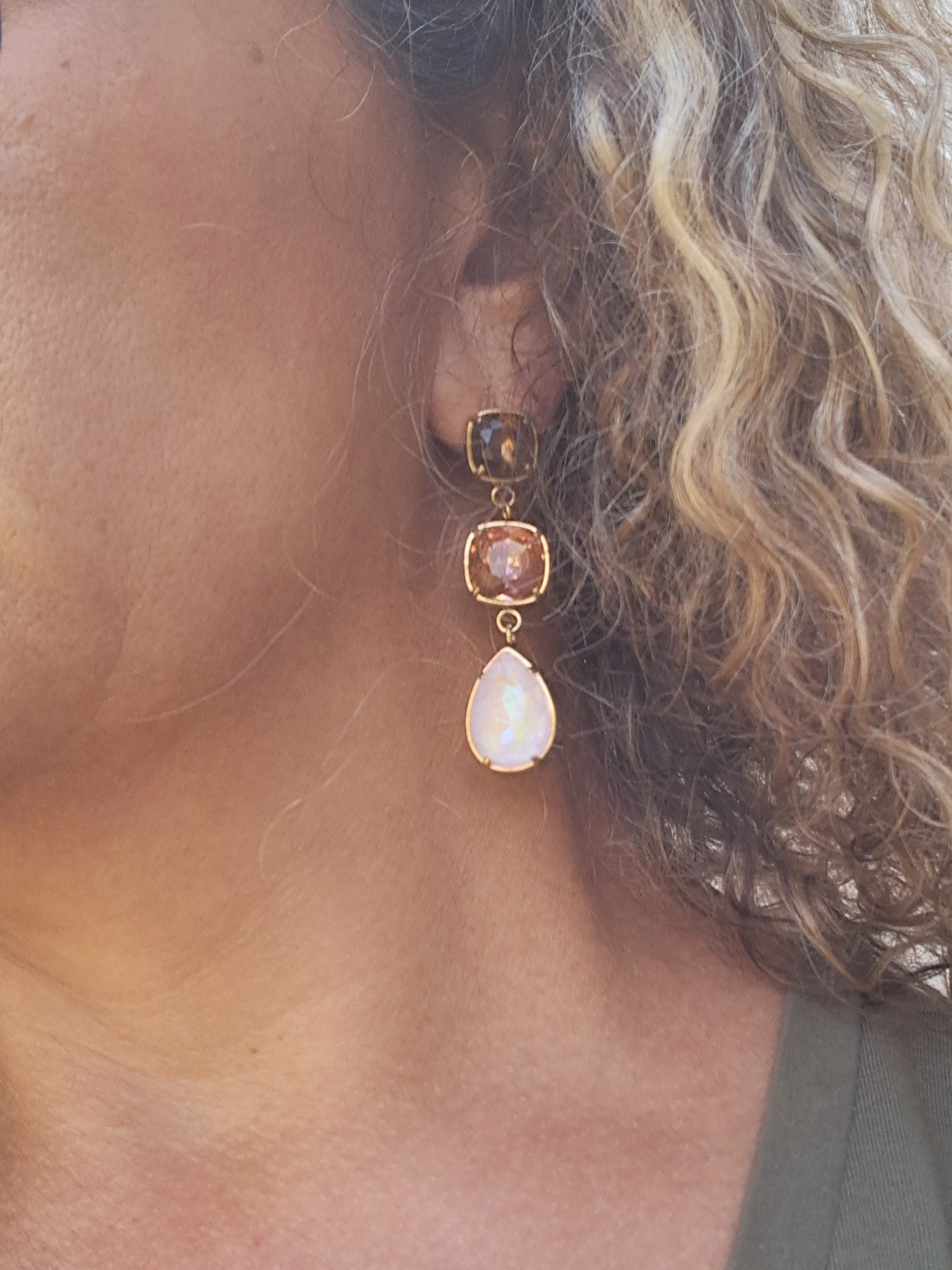 Boucles d'oreilles pendantes en acier inoxydable composées de 3 cristaux, 2 carrés et une goutte.