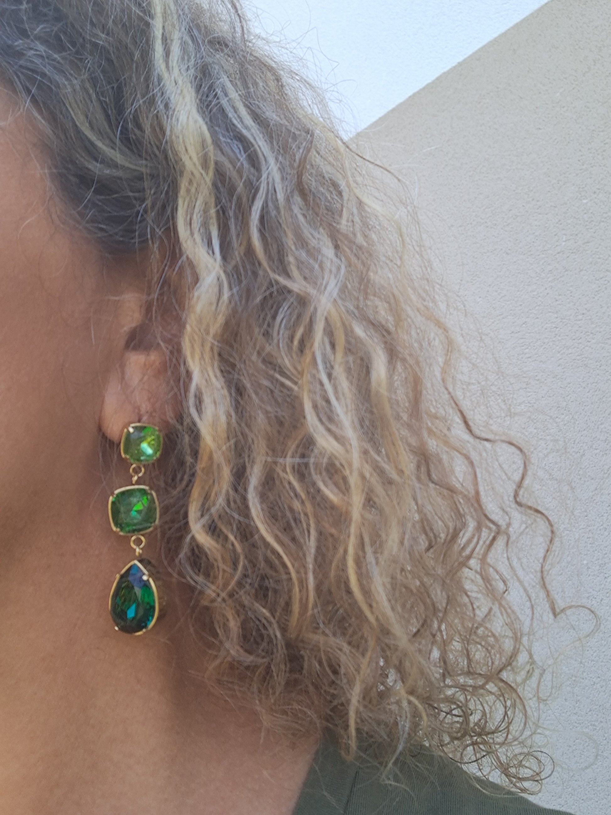 Boucles d'oreilles pendantes en acier inoxydable composées de 3cristaux, 2 carrés et une goutte.