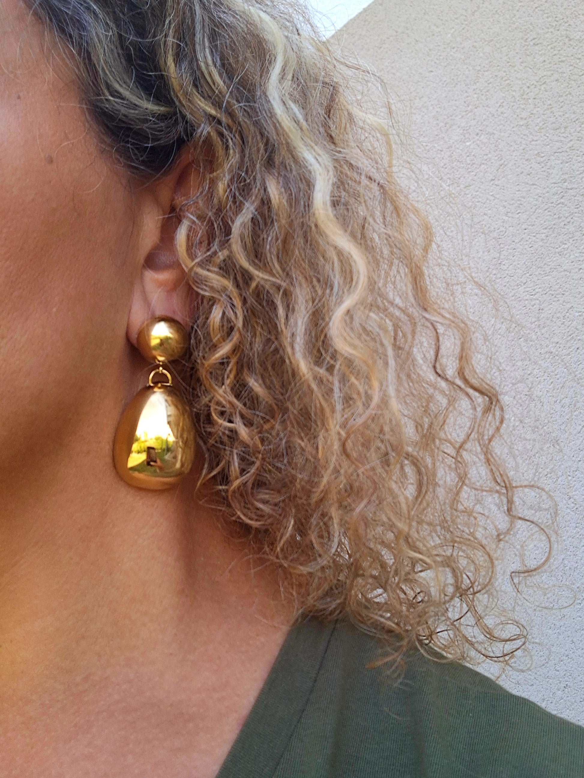 Boucles d'oreilles dorées en acier inoxydable composées d'une puce en forme de demi boule et d'une goutte creuse pendante lisse et effet miroir.