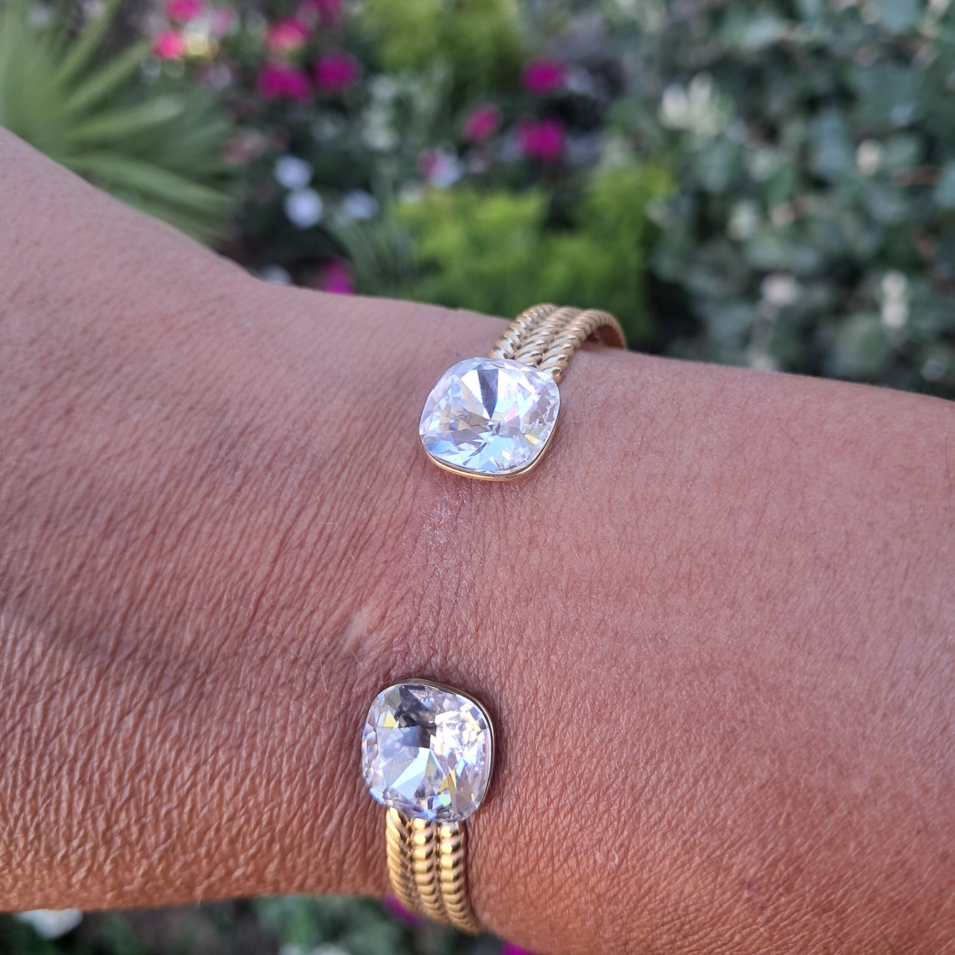 Jonc en acier inoxydable effet tressé orné de deux cristaux Swarovski.